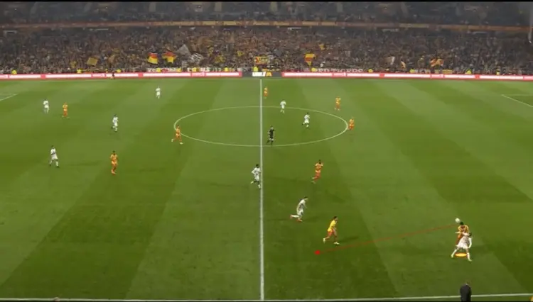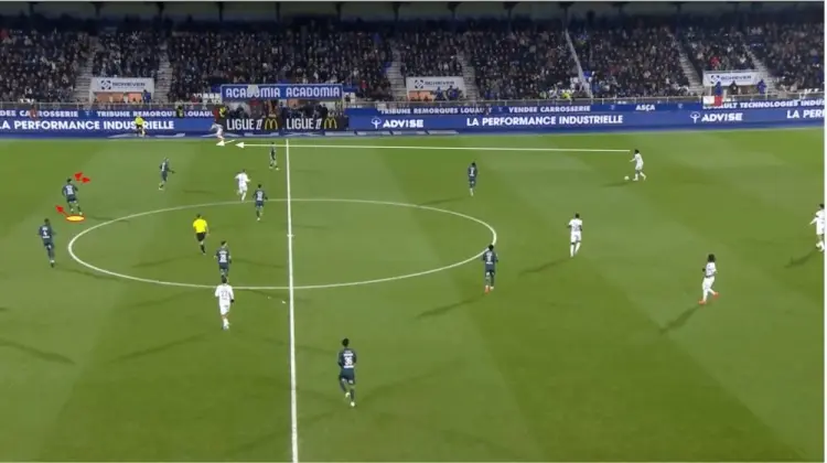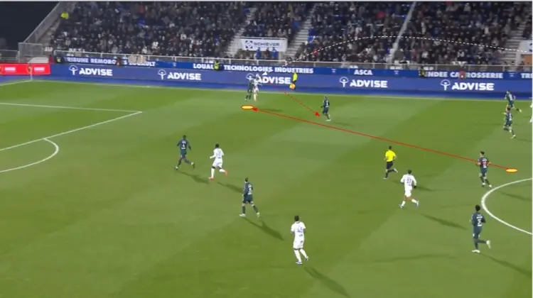 上图中,库萨诺夫在朗斯对阵尼斯的比赛中,出现在四后卫战术的左侧,我们能看到库萨诺夫稍微向前伊布,与一名正试图接球的对手进行对抗。