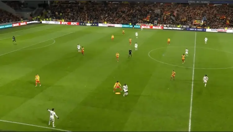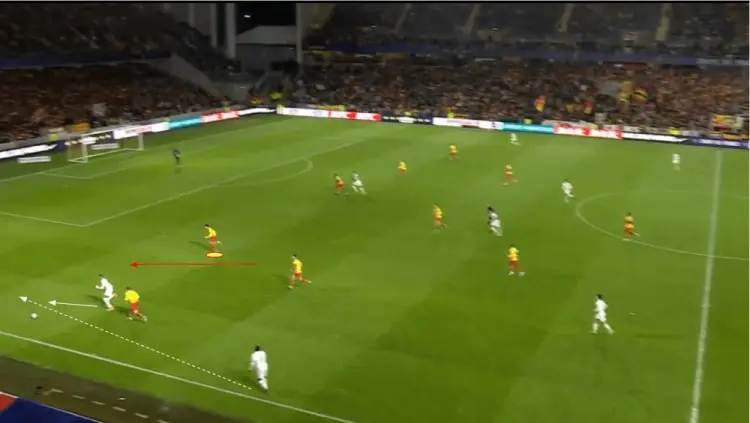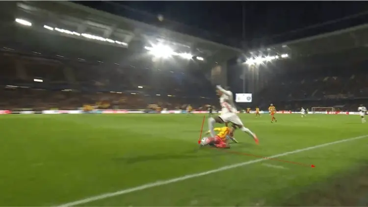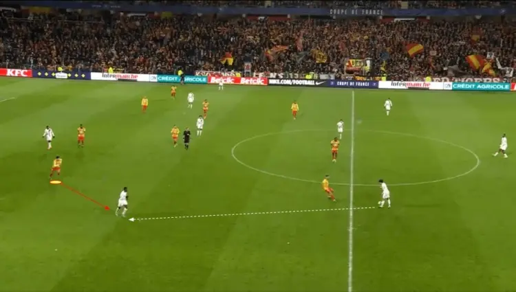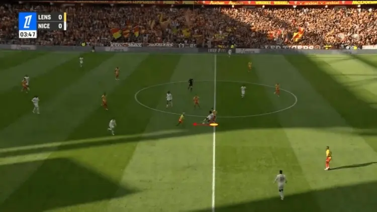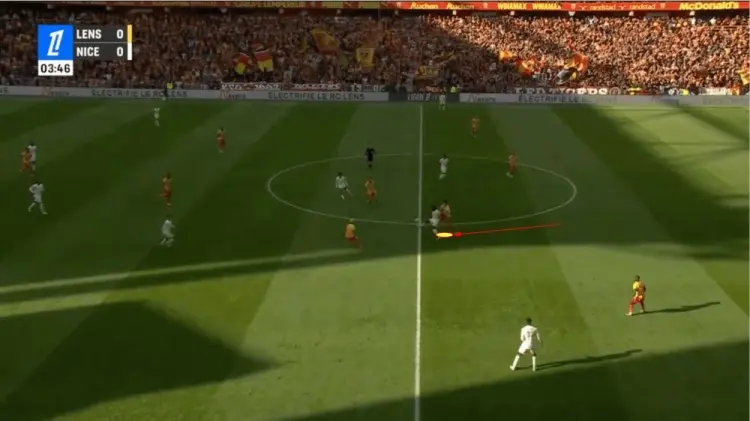 当时,朗斯局部防守人数上存在劣势,而对手又来势汹汹。