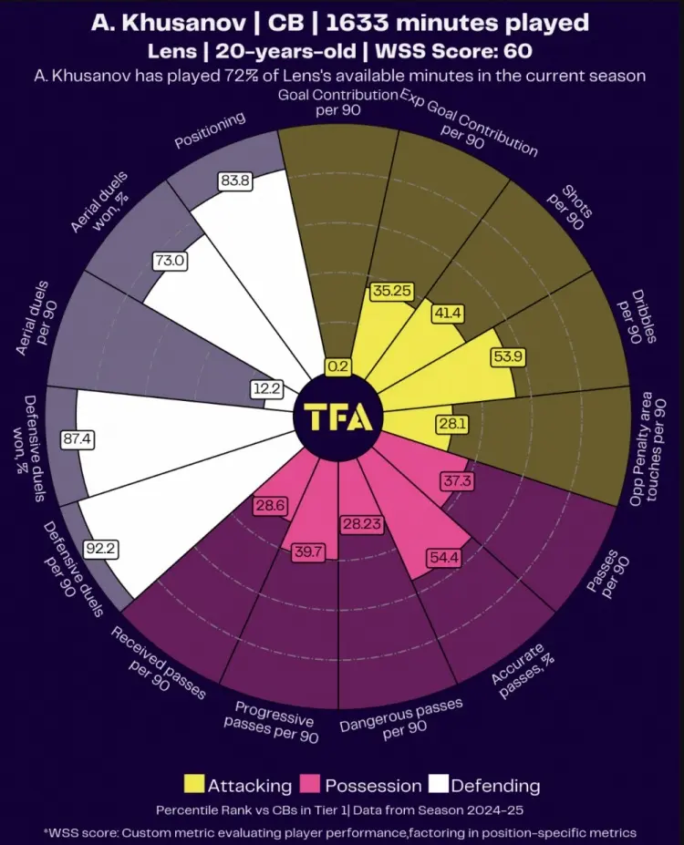 图标通过各种关键指标的百分位数排名,将库萨诺夫与欧洲五大联赛的其他中后卫进行了比较
