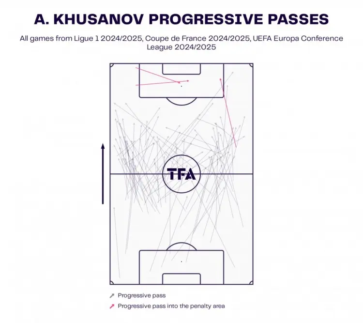 库萨诺夫在2024/2025赛季各项赛事中的推进传递分布图